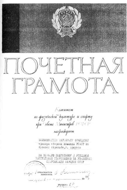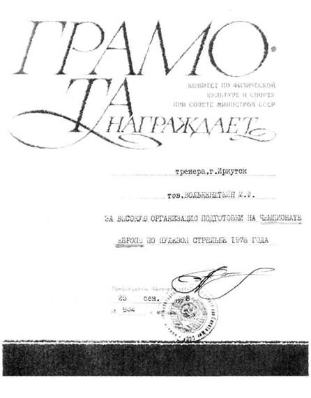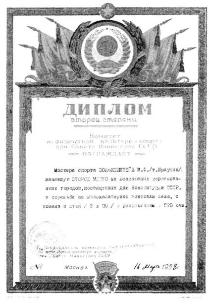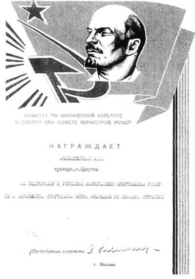 Но спортивные результаты сами по себе никогда не были здесь самоцелью. В команде царил высокий нравственный климат; любой поступок, выходящий за пределы спортивного поведения, моментально получал соответствующую публичную оценку, независимо от прежних заслуг спортсмена. Именно поэтому к иркутским стрелкам было всегда какое-то особое, почтенное и уважительное отношение везде, куда бы мы ни приезжали на сборы и соревнования, даже, со стороны более сильных команд и знаменитостей. И душой команды, ее цементирующим спортивным и нравственным началом были Иоганн Иванович Никитин, Петр Михайлович Точилов и самая красивая «стрельчиха» Советского Союза — наша Маргарита Францевна. Это — личности действительно высоких нравственных принципов, и я твердо убежден, что только такие люди имеют все основания обратиться к широкому читателю с подобными автобиографическими очерками.